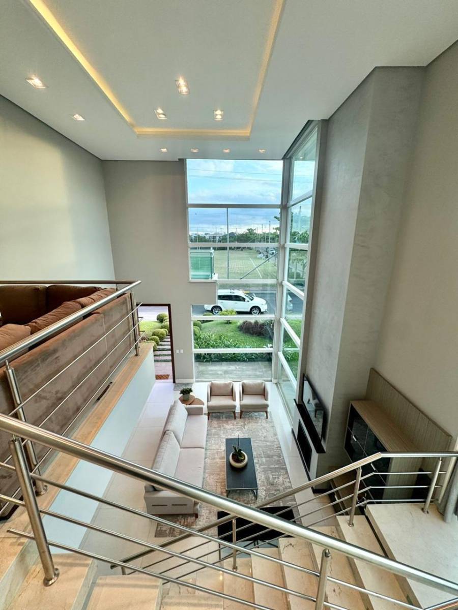 Sobrado de esquina! Frente a infra de lazer do condomínio. 04 amplas suítes (1 master com banheira de hidro), estar íntimo, lavabo, living 3 ambientes com pé direito duplo e lareira revestida, escadaria envelopada, cozinha americana com espaço gourmet e churrasqueira, lavanderia, garagem fechada para 2 carros, pátio com piscina, lindo jardim, cortinas automatizadas, mobília e decoração de muito bom gosto. Aproveite!